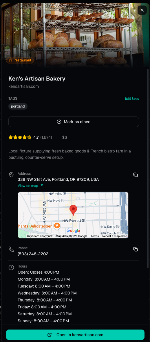 Each saved place becomes a card like this — everything you need, without lifting a finger.